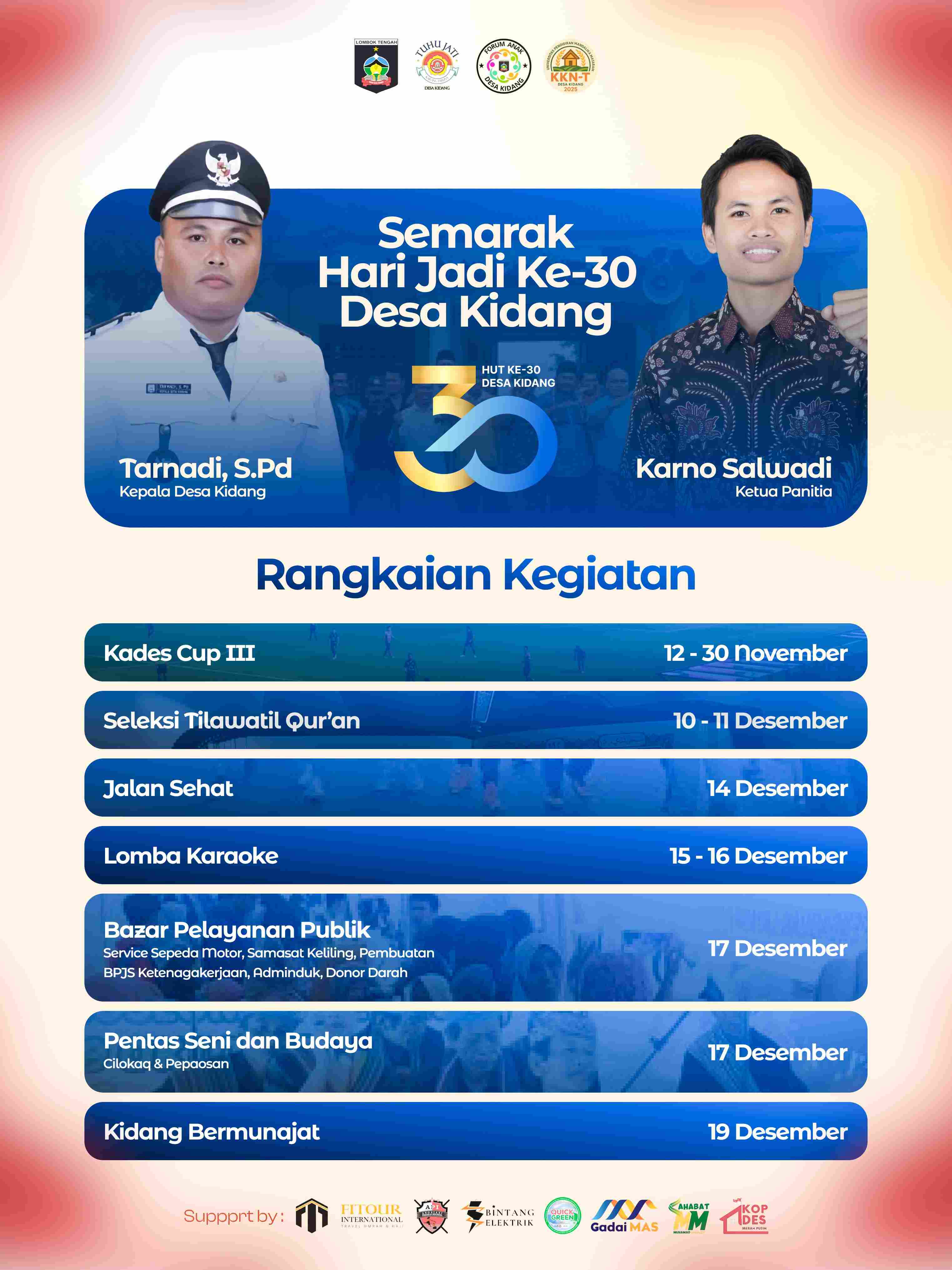 Segala puji dan syukur kita panjatkan ke hadirat Allah SWT atas limpahan rahmat, taufik, dan hidayah-Nya, sehingga kita semua senantiasa diberikan kesehatan, kekuatan, serta kesempatan untuk terus berkhidmat dalam membangun dan memajukan Desa Kidang yang kita cintai bersama.
